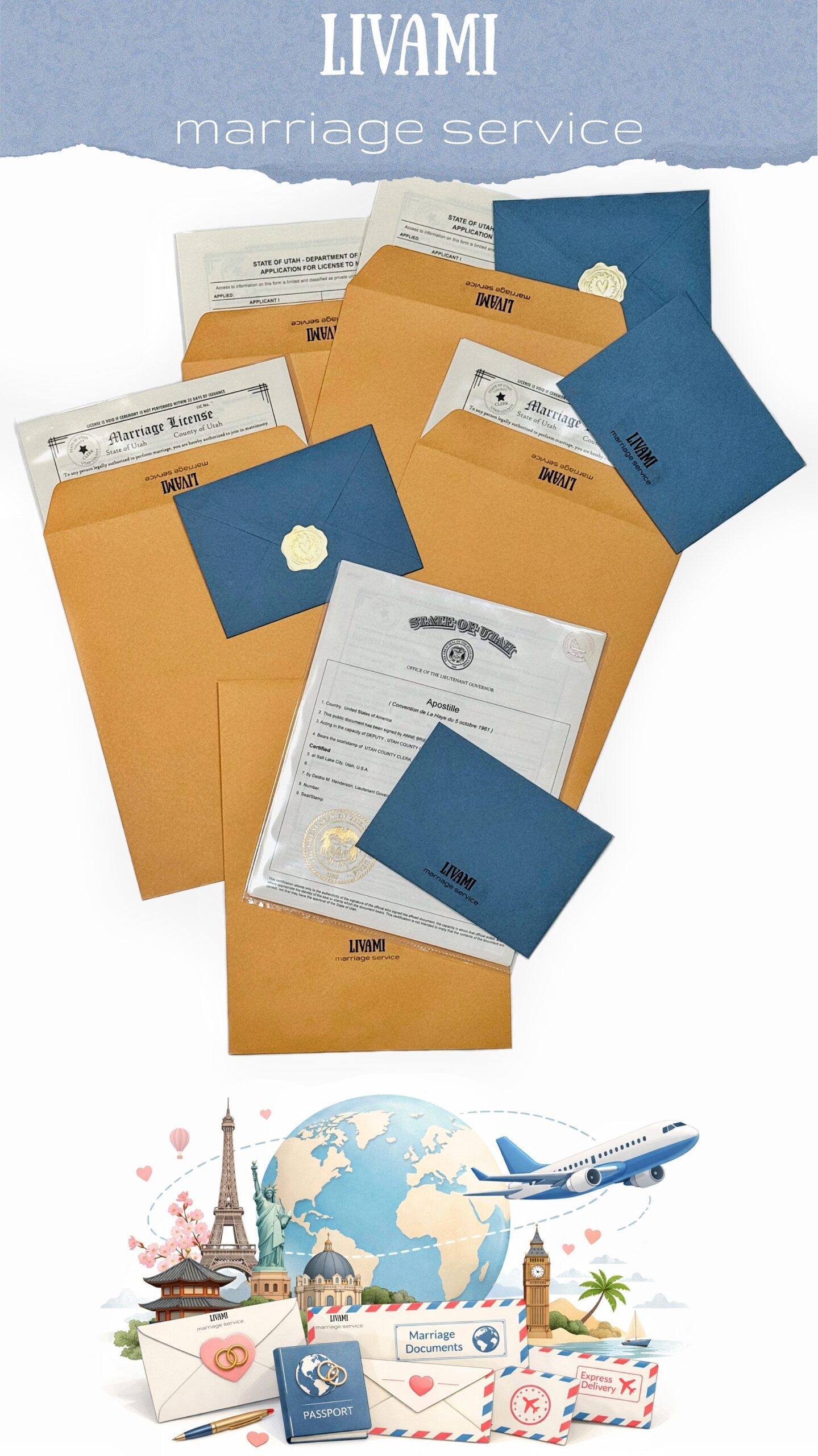 If you've already married in Utah, either independently or with LIVAMI marriage service, but didn't order the necessary documents at the time, we're happy to help. We offer fast processing of your marriage certificate and apostille, and we'll deliver it to you in any country convenient for you, quickly!